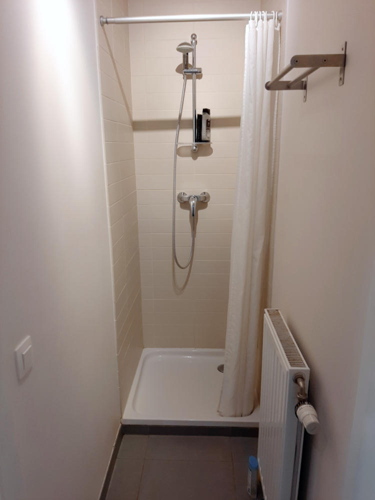 Dit is een recente nieuwbouw studentenwoning met 12 koten: 9 standaard kamers, 1 kot met eigen douche en 2 studio's (kot met eigen douche en kitchenette). Er zijn 4 toiletten, op elke verdieping één, en 3 gemeenschappelijke douches (voor de 9 standaard kamers).