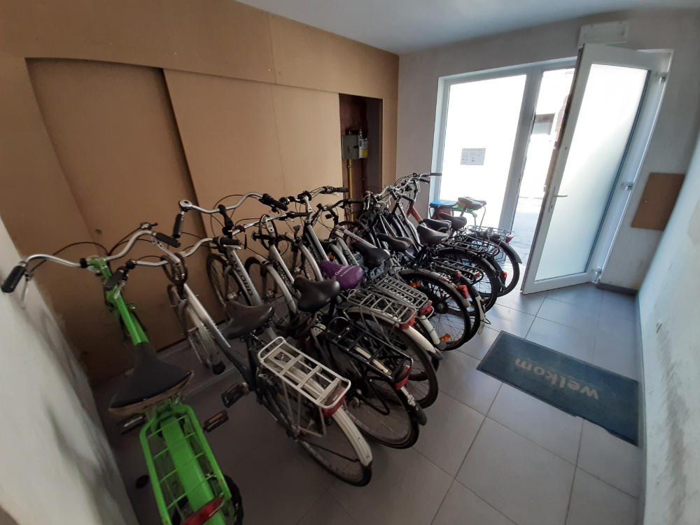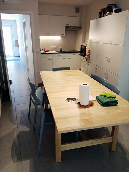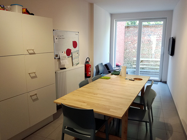 Op het gelijkvloers is een grote gemeenschappelijke keuken met vitrokeramische kookplaat en dampkap met luchtafvoer naar buiten, en 2 gemeenschappelijke ijskasten met elk een diepvriesvak. Iedere student krijgt een opbergkastje voor keukenspullen. De keuken heeft ook een zithoek met televisie. De keuken geeft uit op een koertje met picknicktafel, zodat je op zonnige dagen buiten kan eten of studeren! Je fiets kan je veilig stallen in het fietsenrek in de inkomhal.